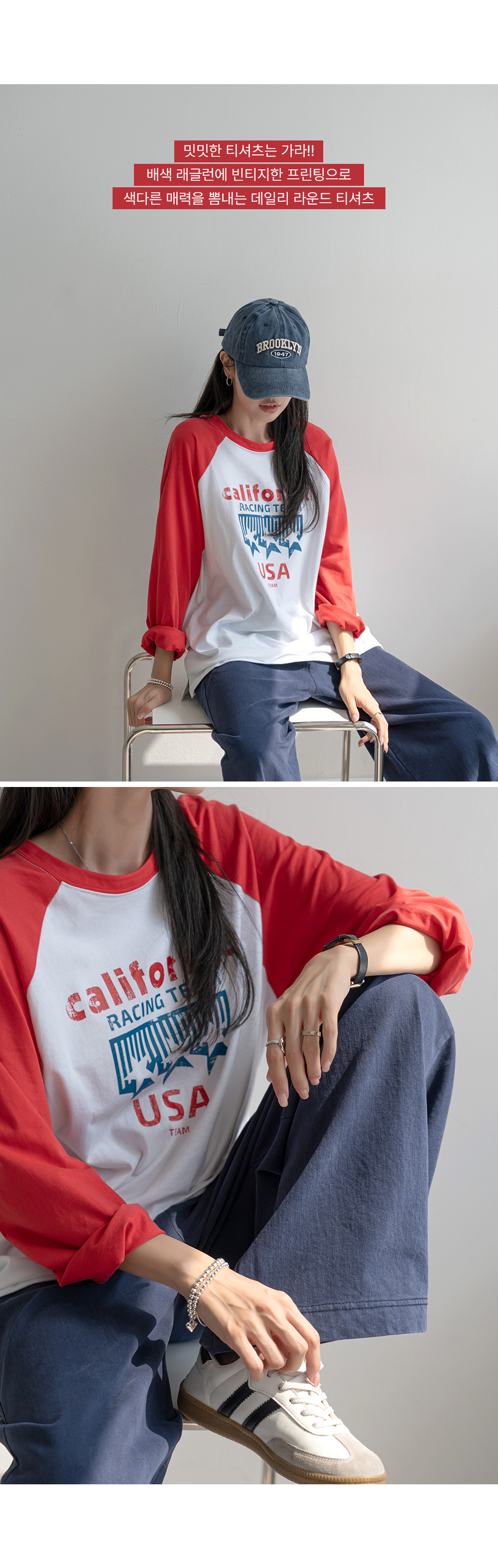 배색 디테일에 나그랑 핏이 캐주얼한 배색 래글런 빈티지 무드 티셔츠